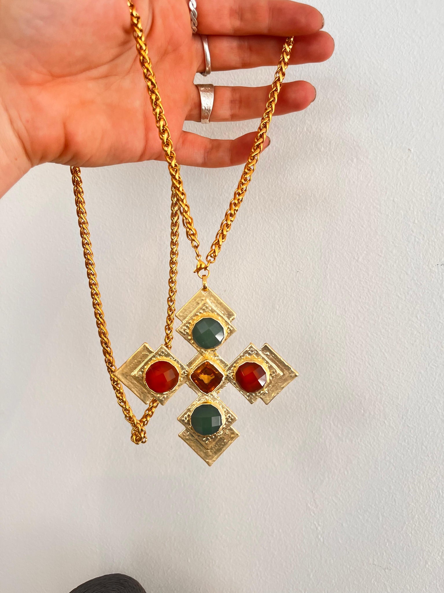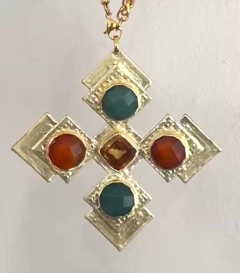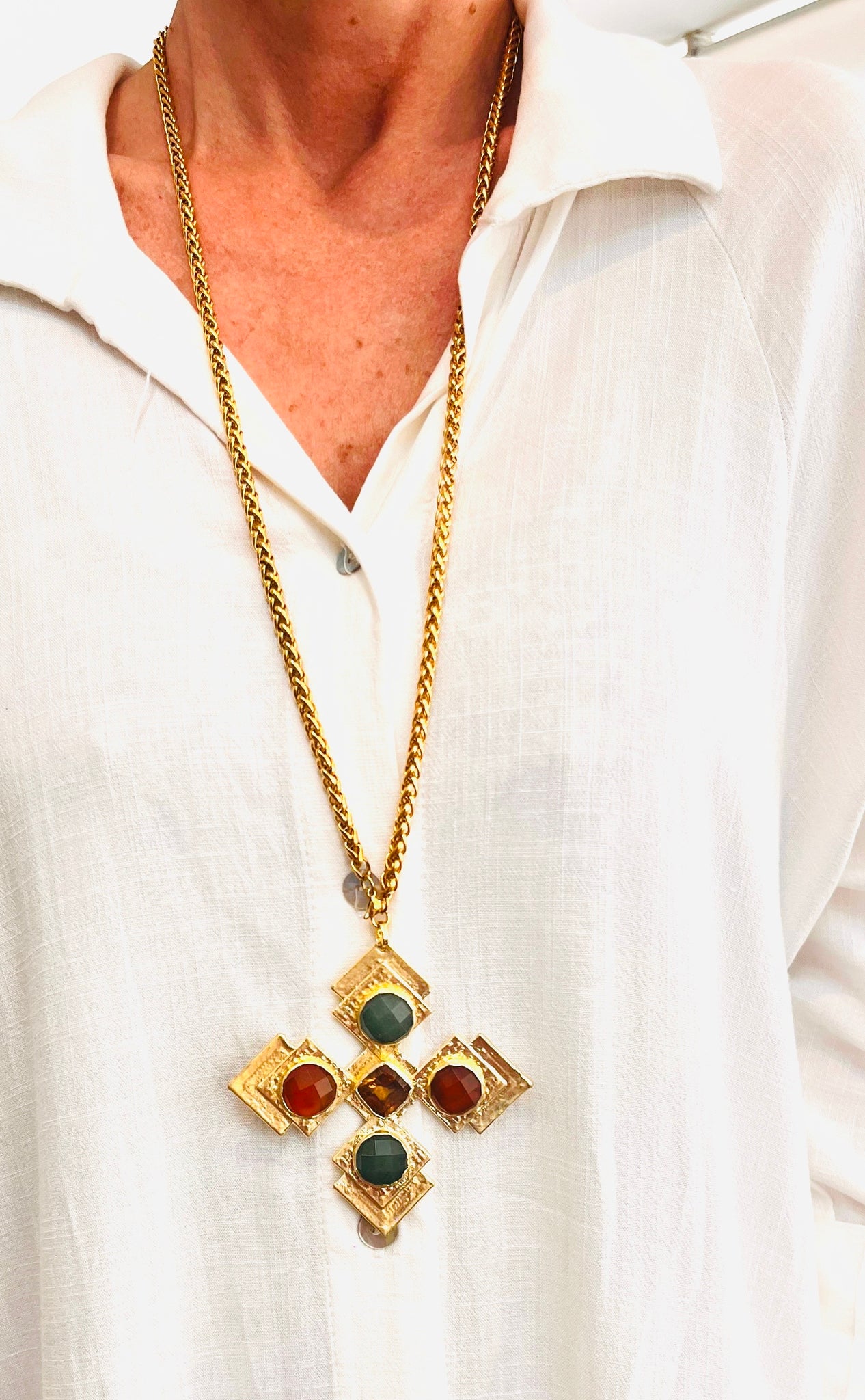 This wonderful and original pendant, inspired by Byzantine culture, is handmade, plated in 18K gold (4,7 microns) and with specially chosen natural stones of the best quality.